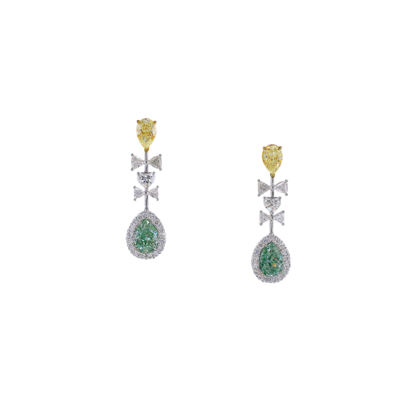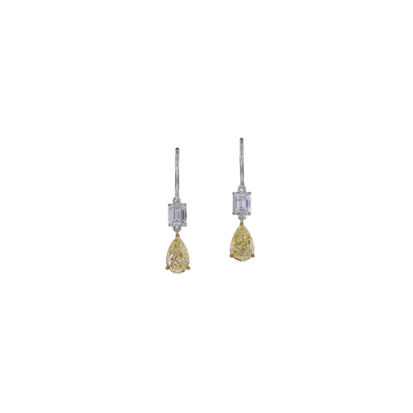 Emerald Cut White Diamond and Pear-Shaped Fancy Yellow Diamond Earrings