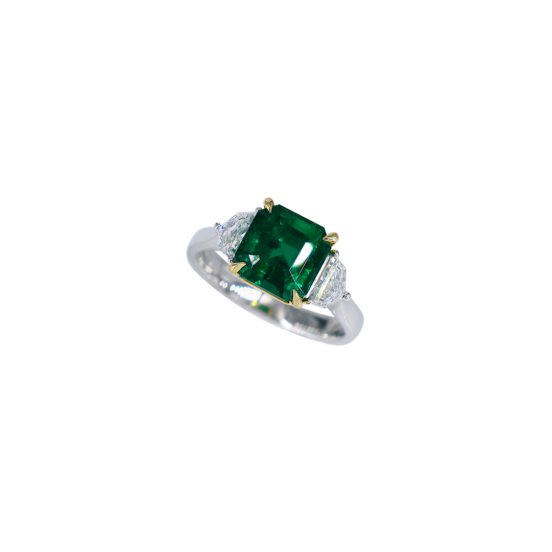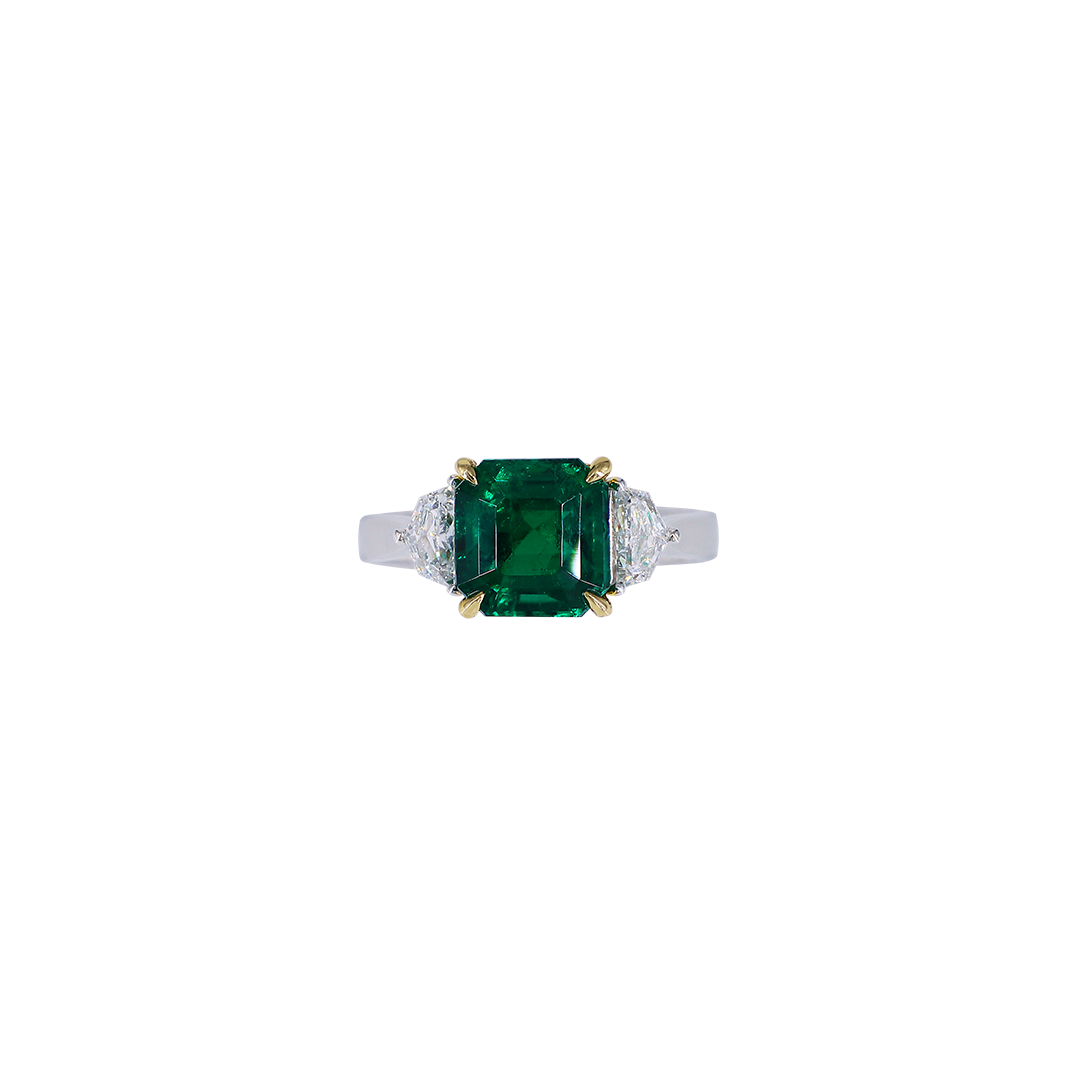 This untreated Colombian emerald, flanked by two diamonds, radiates a rich and captivating glow—free of excess, yet full of serene grace and timeless charm.