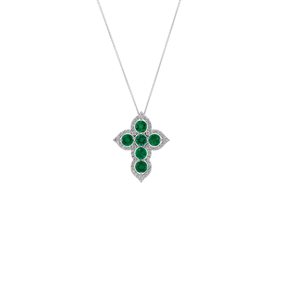This classic cross pendant is set with round emeralds, radiating a lush green glow that symbolizes life and hope, adding a lively spirit to the traditional form. Blending solemnity with elegance, it is not only a symbol of faith but also a timeless and exceptional piece of jewelry art.