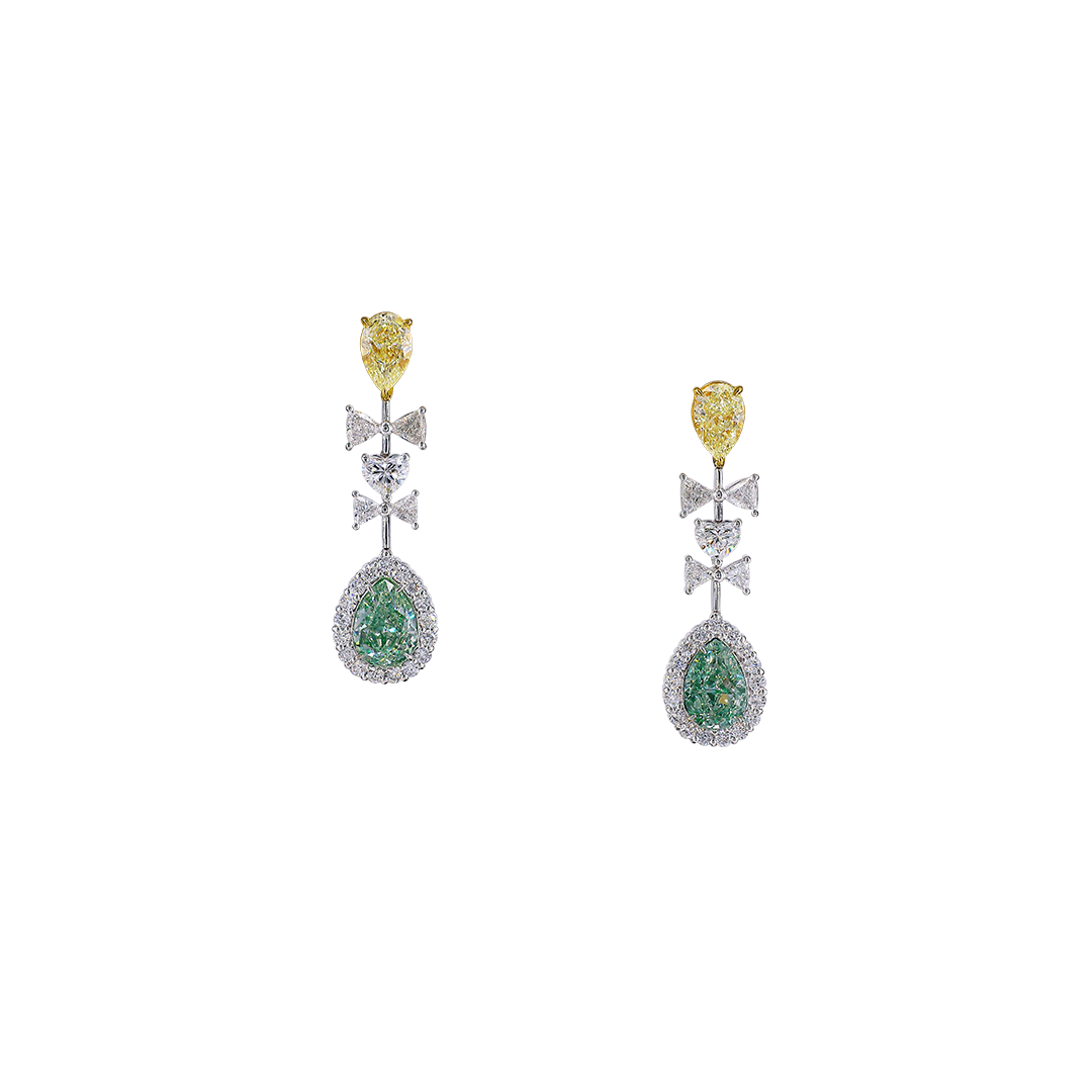 Featuring a pair of pear-shaped light green-yellow diamonds as the centerpiece, these earrings are accented with fancy yellow and white diamonds, layered to create a harmonious play of color and depth. A bow design, crafted from trillion-cut diamonds, adds a lively and whimsical touch. Bright and fresh like a spring garden, the colors dance with sunlight and vitality.