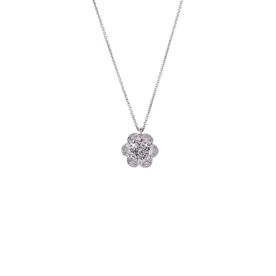 This floral pendant features a ten-sided Metro Cut diamond with extra facets that reflect dazzling brilliance. Its minimalist design enhances the diamond’s shape, radiating a uniquely elegant charm.