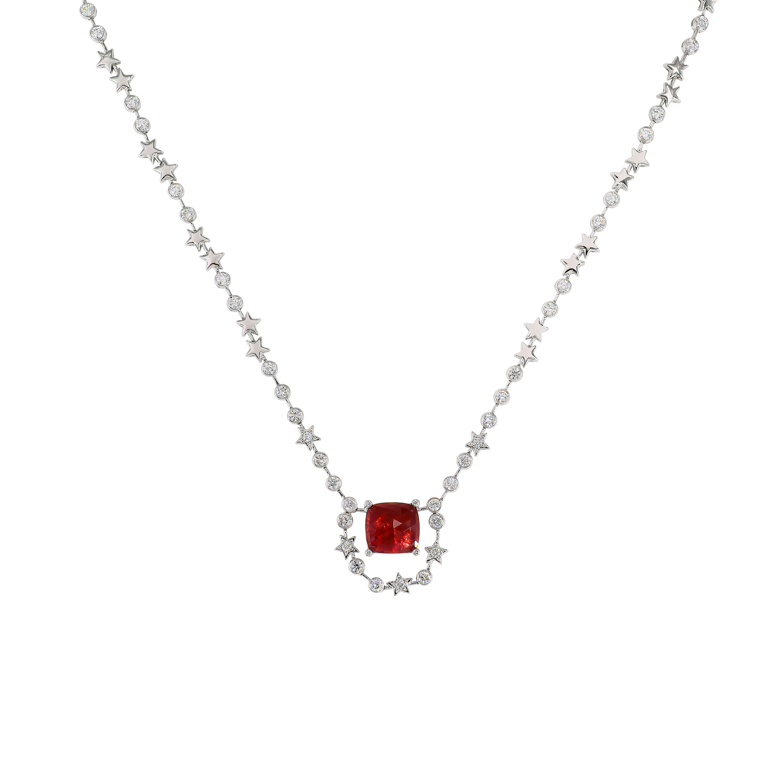 This ruby pendant, adorned with a star motif and sparkling diamonds, highlights the gemstone’s vivid color and radiant energy—illuminating your neckline and brightening every moment of your day.